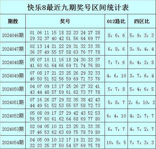 福彩快乐8第2024054期开奖回顾:04 05 09 10 12 17 19 21 22 30 32 33 35 37 50 54 57 69 75 78,其中奖号012路比为10:5:5,跨度为74,质合比为4:16,大小比为6:14,奇偶比为11:9。