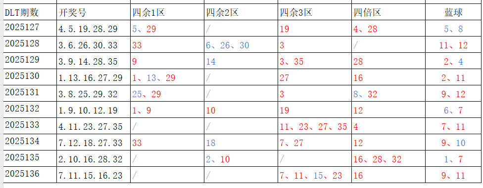 分享第一个数据分析:四分区统计数据。相对于传统的三分区,个人习惯使用四分区,就是把35个红球号码除以4,所得的余数分区如下: