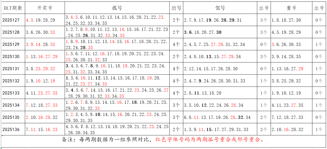 如图,以近两期数据为一组,进行对比分析,相同的孤号、邻号可能在下期开出。本期参考孤号:1.2.3.4.5.9.13.18.19.20.21.25.26.27.28.29.30.31.32.33.34.35;邻号:6.8.10.12.14.17.22.24。重点关注:孤邻号重合号码:***(会员专区可见)。个人分析,仅供参考。