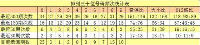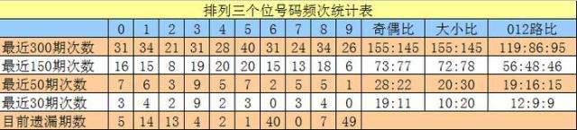 上期回顾:排列三第2024329期开出奖号147,号码012路比为0:3:0,奇偶比为2:1,大小比为1:2,和值为12,跨度为6。