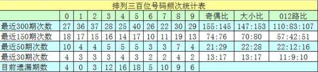 百位号码:前50期走势活跃的号码为:0开出10个,8开出7个,3、4、5开出5个;走势最冷的号码为:6、7开出3个,1、2、9开出4个。奖号012路比开出22:12:16,奇偶比开出21:29。本期百位杀排除:1、2,注意号码0、4、7,胆码参考0。