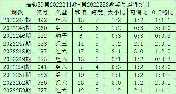 开奖回顾:福彩3D第2022253期开奖号:327,其中奖号和值:12,奇偶比2:1,大小比1:2。