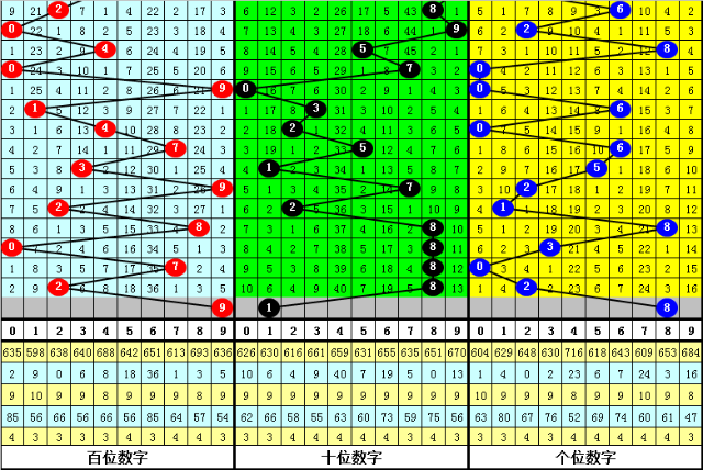 在连续11期奖号中,该位012路比为2:2:7,2路号码相对热出,目前012路号码遗漏期数分别是:9期、5期和0期,本期预计出现1路奖号。