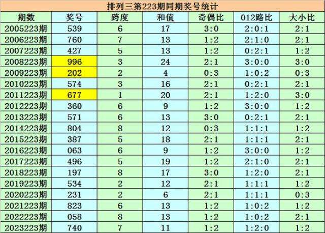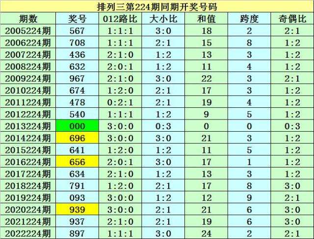 本期为排列三第2023224期开奖,开奖日期为:2023年8月22日,历史上排列三第224期已开出了18次奖号,历年同期开出号码分别为:567-708-436-632-967-674-478-540-000-696-641-656-634-791-093-939-937-897。