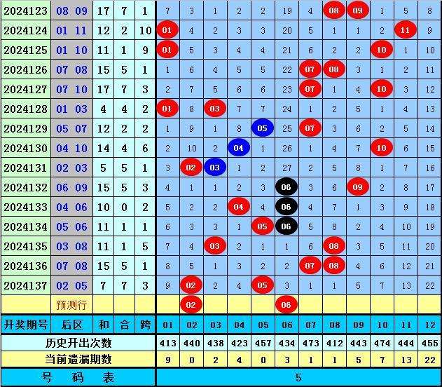 后区分析:上期后区开出全2路号、全质组合,最近10期后区奖号012路比为7:6:7,质合比为11:9,本期看好后区在02、06、07、08、12之内落号,精选后区奖号02、06。
