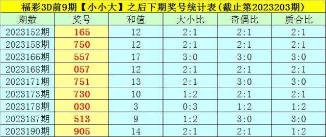 2、奖号质合比分别开出:2:1、1:2、3:0、2:1、2:1、2:1、2:1、2:1、3:0,总质合比开出19:8,其中有1期奖号质合比和上期奖号质合比相等;