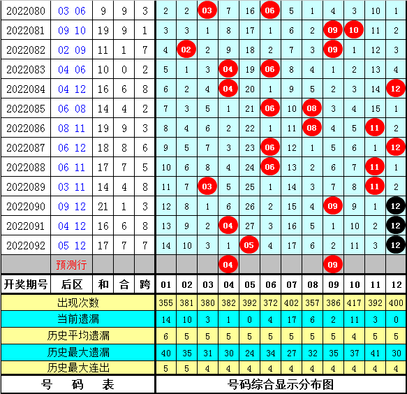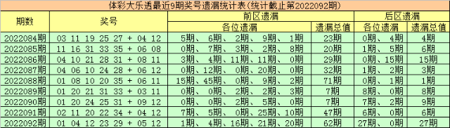 上期回顾:体彩大乐透第2022092期开出奖号为:01 04 12 23 29 + 05 12,其中前区各位奖号分别遗漏:1期、4期、16期、21期和20期,遗漏总值为62期,后区号码分别遗漏27期和0期,遗漏总值为27期。