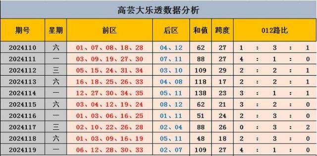 大乐透2024119开奖奖号:前区06,12,28,30,33,后区02,07,前区号码和值109,跨度27,012路比4:1:0。
