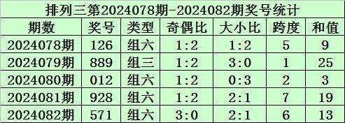 上期回顾:排列三第2024082期开奖号码为571。奖号类型为组六,奇偶比为3:0,大小比为2:1,跨度为6,和值为13。