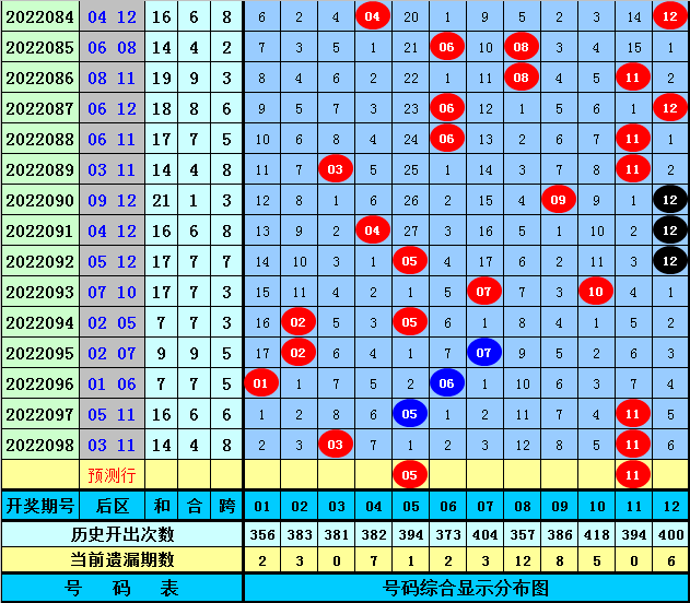 范闲大乐透第2022099期前区012路分析:上期前区012路比为2:2:1,各路号码走势基本相当;最近7期前区012路比为9:15:11,1路奖号热出。