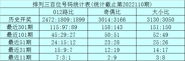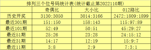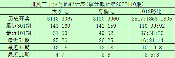 在连续11期奖号中,该位奇偶比为3:8,奇数出现较少,本期适当关注奇数回补;