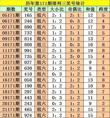 历年第171期奖号中:组三开出3次,组六开出15次。组三较少,本期注意组三反弹。