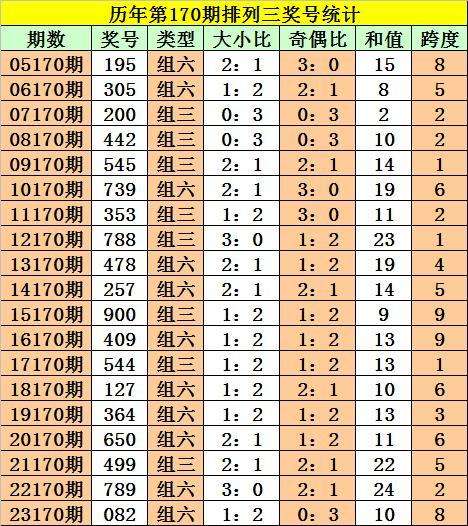 排列三第2023170期奖号:082,和值10,跨度8,大小比1:2,奇偶比0:3。