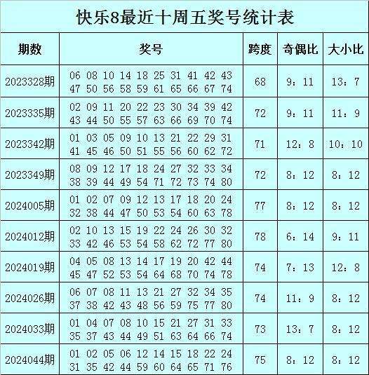 福彩快乐8第2024044期开奖回顾:01 02 05 06 12 14 15 18 22 24 31 35 42 44 59 60 64 65 71 76,其中奖号奇偶比为8:12,大小比为8:12,012路比为7:5:8,首尾间距为75。