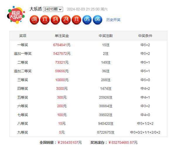 体彩大乐透第2024015期开出奖号:08、11、14、24、31+05、06。其中前区奖号012路比为1:1:3,奇偶比为2:3,后区开出2路号码和0路号码。