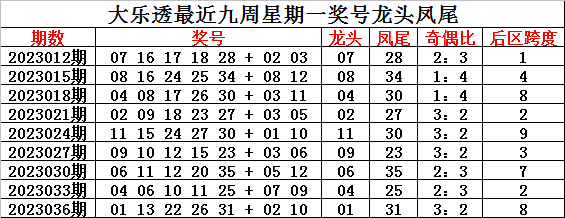 后区跨度分析:前九周星期一后区3以上的跨度出现5次,3以内的跨度出现4次,大号跨度星期一开出比例较高,本周星期一注意后区大跨度,两码参考05 11。