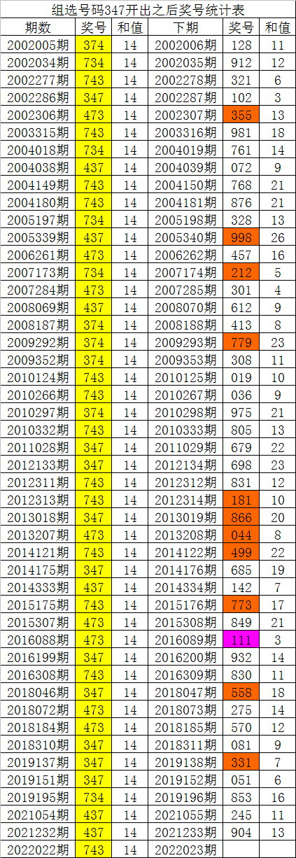 福彩3D第2022022期开出组选号码:347,该号码历史上组选出现了47次,其下期分别开出了号码:128、912、321、102、355、981、761、072、768、876、328、998、457、212、301、612、413、779、308、019、036、975、805、679、698、831、181、866、044、499、685、142、773、849、111、932、830、558、275、570、081、331、051、853、245、904,如图: