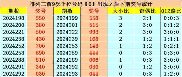 个位号码:上期奖号为小 号、偶数、0路号码:0,历史上个位号码0共开出674期,前一次出现在第2024292期,上期遗漏5期再出。