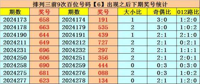 在百位前9次出现号码6之后,下期百位分别开出奖号:1-5-4-7-2-3-4-0-1,其中开出号码个数012路比是2:5:2,奇偶比是5:4,大小比是2:7。