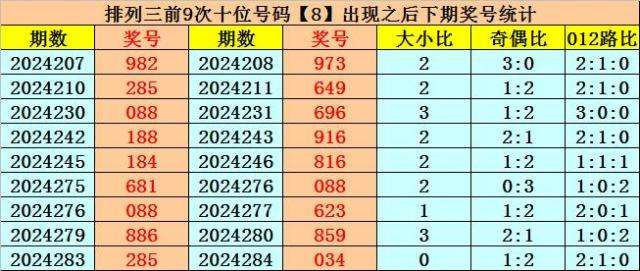 十位号码:十位上期开出偶数、小 号、2路号码:8,历史上十位号码8共开出725期,上一次出现在第2024283期,上期奖号遗漏值为14期。