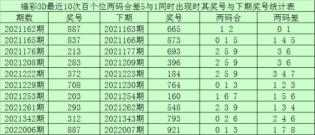 从以上统计可以看出,百十位两码合差5与1同时出现之后其下期两码合差表现最热的4个分别为:1367,本期百十位两码合差可以参考这四码中的数据。