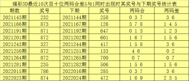 从以上统计可以看出,百个位两码合差5与1同时出现之后其下期两码合差表现最热的4个分别为:1235,本期百个位两码合差可以参考这四码中的数据。