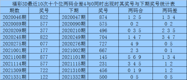 十个位合差分析:上期奖号十个位开出77组合,两码合为4,两码差为0,最近10次十个位两码合4与两码差0同时出现时,其奖号和下期奖号分别为:
