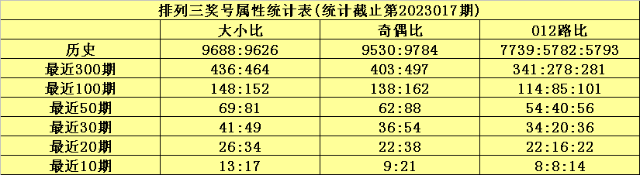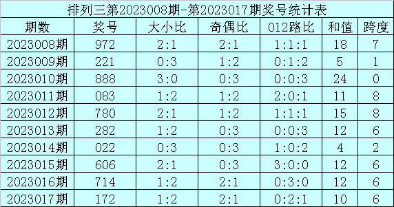 上期回顾:排列三第2023017期奖号为172,奖号012路比为0:2:1,奇偶比为2:1,大小比为1:2,和值为10,跨度为6。