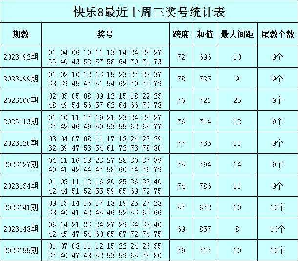福彩快乐8第2023155期(上周三)回顾:01 07 08 11 12 15 22 24 26 35 37 40 47 48 52 53 59 65 75 80,其中奖号首尾间距为79,和值为717,最大间距为10,尾数分布为:尾数3、4、6、9包含1个号码,尾数0、1、8包含2个号码,尾数2、7包含3个号码,尾数5包含4个号码。