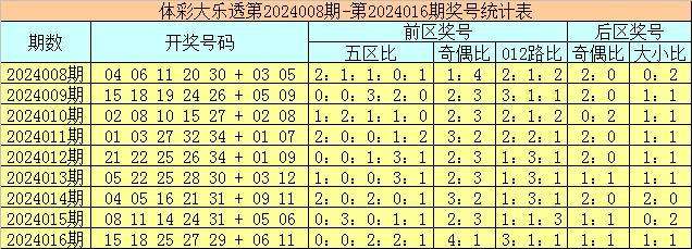 体彩大乐透第2024016期奖号为15 18 25 27 29 + 06 11,前区号码五区比为0:0:2:2:1,奇偶比为4:1,012路比为3:1:1,后区号码奇偶比为1:1,大小比为1:1。
