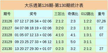 大乐透第23130期开出奖号为:13、20、27、29、30 + 01、07,前区三区比0:2:3,奇偶比为3:2,012路比为2:1:2,开出1枚重号27。