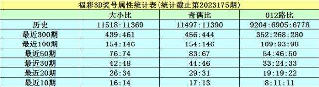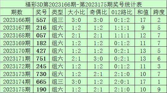 开奖回顾:福彩3D第2023175期奖号为190,其中奖号大小比为1:2,奇偶比为2:1,012路比为2:1:0,和值为10,跨度为9。