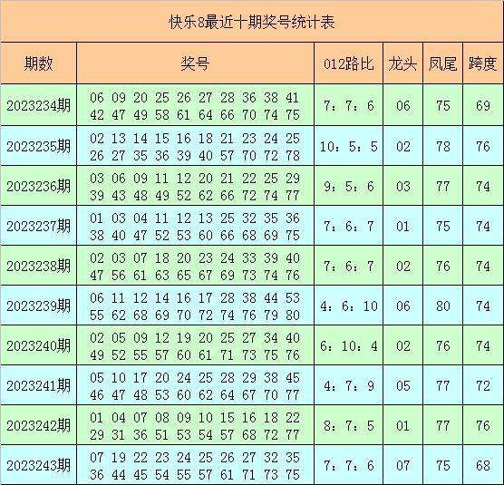 快乐8第2023243期奖号为:07 19 22 23 24 25 26 27 32 35 36 44 45 54 55 57 61 71 73 75,其中奖号012路比为7:7:6,跨度为68。