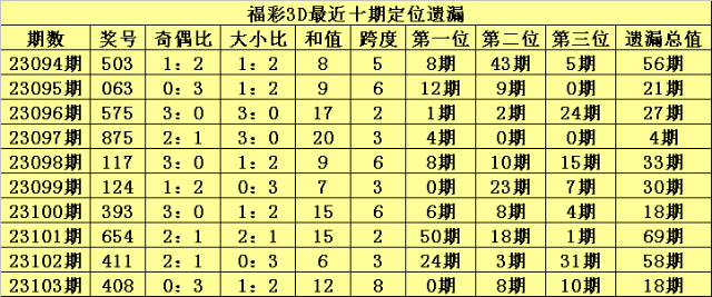 开奖回顾:福彩3D第2023103期奖号:408,百位号码遗漏0期、十位号码遗漏8期、个位号码遗漏10期,遗漏总值为18期。