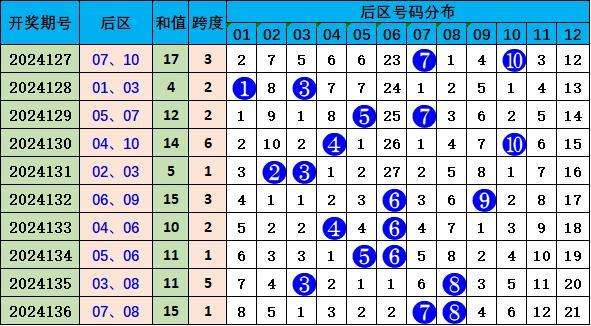 上期后区开出:07、08,和值为15,跨度为1;通过和值、跨度走势分析,本期预测推荐和值12,跨度为4。