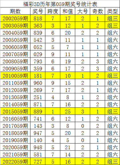 从以上统计可以看出,历年3D第060期开出了8次组三号码,开出了12次组六号码。组三号码和组六号码基本相当,本期预计开出组六号码。