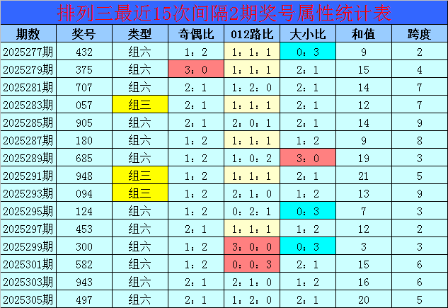 排列三第2025305期奖号为497,奖号组选类型为:组六,012路比为1:2:0,奇偶比为2:1,大小比为2:1,和值开出20,跨度开出5。
