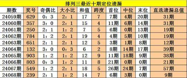 开奖回顾:排列三第2024068期奖号:239,定位直选遗漏值6期、3期、0期,遗漏总值为9期。