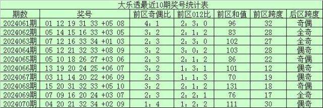 大乐透第2024070期开奖,前区:04、20、21、32、34;后区:02、09。其中前区和值为111,跨度为30,012路比为1:2:2,奇偶比为1:4,后区开出一偶一奇、2路+0路组合。
