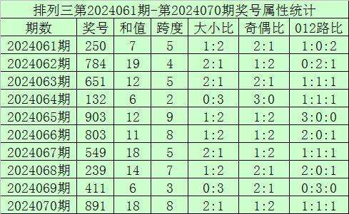 上期回顾:排列三第2024070期开奖号:891,奖号和值:18,奇偶比1:2,大小比2:1。