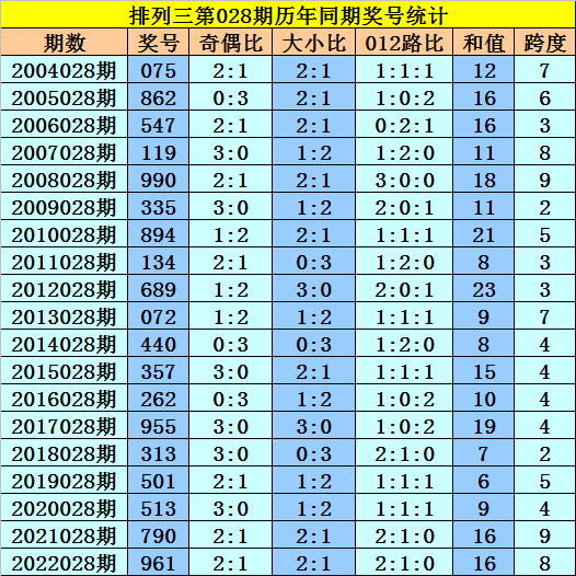 在第028期历史同期开奖中,号码0-9出现频次从高到低分别为:号码5、9→8次;号码1、3→7次;号码0→6次;号码4、7→5次;号码2、6→4次;号码8→3次。一般来说,表现最热的号码:1359中至少出现1个奖号。同时奖号不会全部出现在表现最冷的号码中。