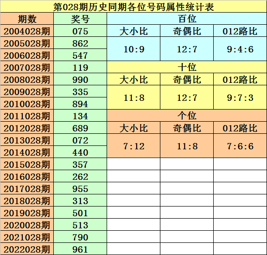 第028期历史同期开奖中,百位号码振幅分别为:8-3-4-8-6-5-7-5-6-4-1-1-7-6-2-0-2-2,波动范围在0-9之间,大小号码比例开出10:9,奇偶号码比例开出12:7,012路号码比例开出9:4:6,本期看好百位出现大号,胆码参考9。