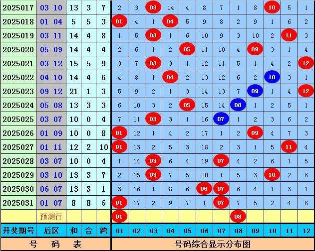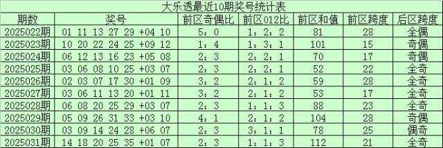 大乐透第2025031期开奖,前区:14、18、20、25、35;后区:01、07。其中前区和值为112,跨度为21,012路比为1:1:3,奇偶比为2:3,后区开出全奇、全1路组合。