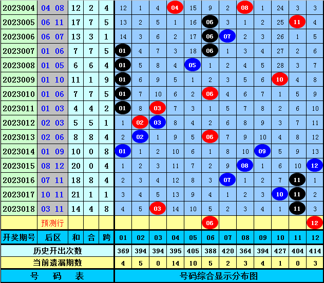 后区分析:上期后区开出遗漏5期和0期的奖号03和11,最近10期后区冷温热码(遗漏期数大于9期为冷码,遗漏4-9期之间为温码,遗漏0-3期为热码)出现个数比为6:4:10,目前后区号码遗漏期数分别为:号码03、11遗漏0期,号码10遗漏1期,号码07遗漏2期,号码08、12遗漏3期,号码01、09遗漏4期,号码02、06遗漏5期,号码05遗漏10期,号码04遗漏14期,本期后区参考号码03、06、10、11、12,精选两码06、12。