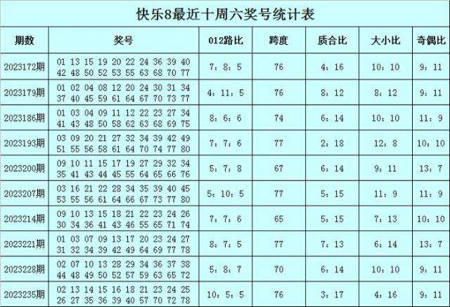 福彩快乐8第2023241期开奖回顾:05 10 17 20 24 25 28 29 38 45 46 47 48 53 60 62 64 67 70 77,其中奖号012路比为4:7:9,跨度为72,质合比为6:14,大小比为11:9,奇偶比为9:11。