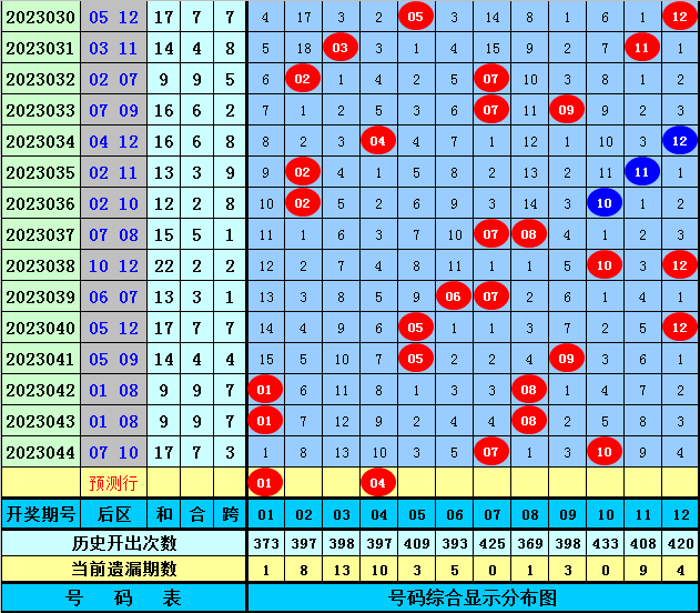 后区分析:上期后区两码开出07+10,为全大组合,近50期后区全大组合出现14次,全小组合出现9次,一大一小组合出现27次,,近10期后区全大组合出现3次,全小组合出现0次,一大一小组合出现7次,本期预计后区为全小组合,推荐两码01、04。