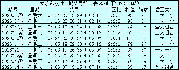 大乐透第2023044期奖号为,前区:02、06、07、08、15;后区:07、10。其中前区奖号三区比为4:1:0,和值为38,跨度为13,后区开出全大组合。