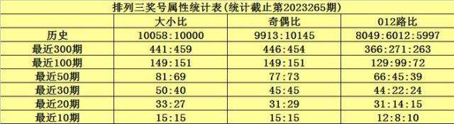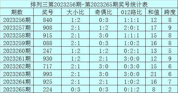 上期回顾:排列三第2023265期奖号为224,奖号012路比为0:1:2,奇偶比为0:3,大小比为0:3,和值为8,跨度为2。