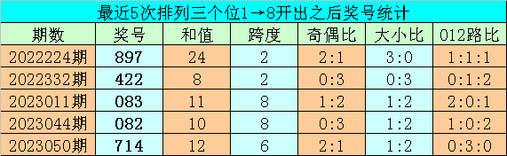 1、排列三前两期个位分别开出号码1和8,历史上个位号码连续两期分别出现1和8时,共有65次。在最近5次出现时,其下期分别出现号码:897、422、083、082、714;