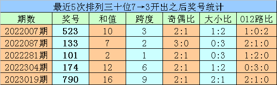 1、最近两期排列三十位号码开出号码分别为7和3,历史上十位号码连续两期同时出现号码7和3的奖号共开出59期。最近五次下期开出号码为:523、133、101、174、790;